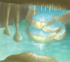 長い時をかけて降り注ぐ石灰成分が溶け込んだ水が再結晶化し、複雑な階層構造を創り出したといわれており、その全く人為的なものを感じさせない外見は、不思議と見るものの心を捉えて離す事はありません。