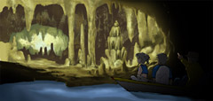 おねえさん「ほんとね。外の海も綺麗だけど、こっちはこっちで綺麗ね〜。あ、船着場に着いたみたい。ここからは歩いて洞窟の奥に進めるのね」